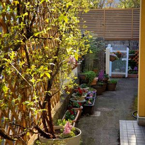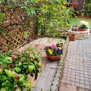 孫と一緒に作ったテラス❓️(*^^*) に鉢植えを添えて(^ー^) ガーデニングは楽しいね😁