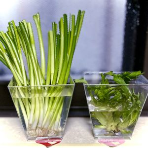 水耕栽培ならぬ 料理のついでに水栽培😆🤗🤭 今日の公式コラムが 「おうちでできる水耕栽培」でしたね💖 コレは、夕飯に使った残りを水に挿しただけ🤣 おネギは、コレで伸びるはず 春菊は…根っこが出たら…育つかな たぶん🤔ね👍