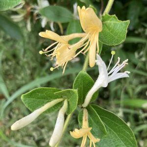 おはようございます💚 雨上がりの六月初日 気分アップして⤴️ 今日のお花 スイカズラ 散歩道で見かける花🤍💛💚 ①② ③庭の紫陽花 ダンスパーティー ④アナベル 沢山蕾が付いてくれた ダンスパーティーより 花が少し遅いようです🤍✳️ 権現堂から お買い上げしました ✳️🤍✳️🤍✳️🤍✳️ ⑤杏の実 今年は花が沢山咲いて どれだけ実が付くかと 想像してたら💭 2個🧡🧡 ジャムの夢も🫥 今月も宜しくお願いします 😉🥰💭💭💭