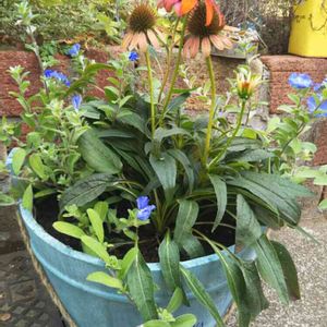 こんばんは😃🌃 曇り⛅ 曇りでしたが湿度が高くて蒸し暑かったですね😱 水やりだけで汗だくでした😱 エキナセアとアメリカンブルーの寄せ植🌱 昨日、友人といつものお花屋さんに出掛けた🎵 見るだけのつもりがやはりそれではすまなくて😅苗を5個連れて帰ってしまった😅 そしておまけにガーベラを5本も頂いてルンルンで帰ってきた😊🎶 木製の鉢を先週買ってあったのでエキナセアさんとアメリカンブルーさんを寄せました🎵 お花が少なくて寂しかったので、とても嬉しいわぁ~⤴🎶 さあ、何処に置きましょうか❓💕