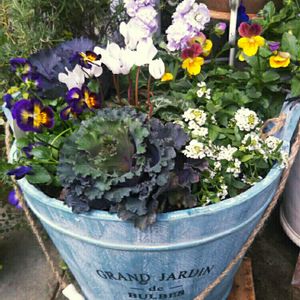 おはようございます🎵 晴れ☀ 天気予報ハズレましたぁ~⤴\(^o^)/🎶 ビオラ動物シリーズの寄せ植え🎵 昨日のシュシュの約束(ビオラ)さんは株が立派だったのでお一人様で植えました😊 でも、ちょっと寂しげだったね😅 こちらはストックやシクラメン、アリッサム、葉牡丹等をビオラ(動物シリーズ)に加え少し華やかにしました🎵 この2種類の葉牡丹もシックなお色に惚れてお連れしました😃😍💓 今日も素敵な一日になります様に💕