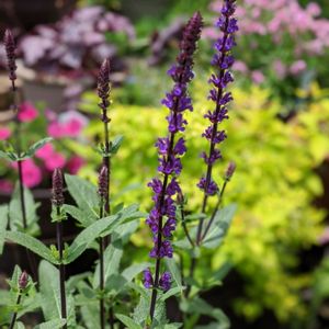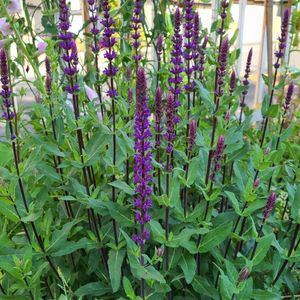 田んぼ横スペースに地植えの サルビア ネモローサ 切り戻し後綺麗に咲いています 日差しを浴びて紫色の花が 輝いて見えます
