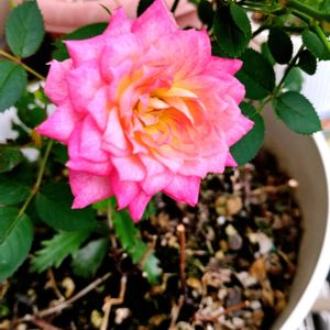 華やかなバラが咲く前に,かわいいミニバラが咲きました ピンクとオレンジのグラデーションが素敵な色合いで とても優しい雰囲気を、かもし出しています❣️