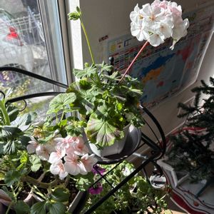 手前はネットで買ったゼラニウム、ニューダブルピンクに似てるかな? 奥は最近花屋に出回ってるホワイトtoローズ(^^) 冬でもお花を楽しみたいので、室内にフラワースタンドおきました♪