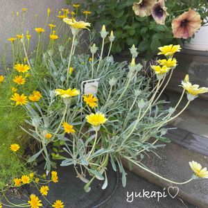 ダークベルグデージー🌼 冬越ししました*\(^o^)/* ちょっと花が小さい。。\(//∇//)\ 向こう側のシルバーリーフは🌿 ガザニアさん♡ 蕾がいっぱいです♫ さっきもう終わりのビオラさん達を 撤収💧 鉢を上げたらデカいムカデが🐛💦 殺虫しました💢 前に。。家の中にいたというトラウマです 気持ち悪い(°_°)