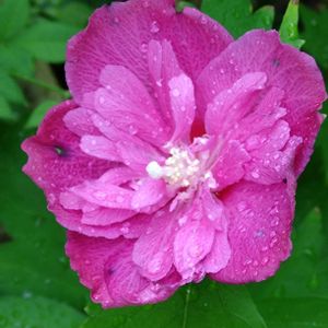 バス停横に八重のムクゲ🩷が雨に濡れていました こちらは恵みの雨となりましたが、被害のあった方々のお見舞い申し上げます