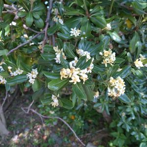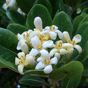 おはようございます☺ トベラ 別名 トビラノキ 扉の木 雌雄異株 海浜植物なので🌿厚いです。 でもこの辺りの公園にも植樹されてます。 雌木には赤い実が😊 こちら、子房大きいような気がするけど雄しべ発達してるから雄花かしら… お花いい香りで 白→クリームに色変わります。