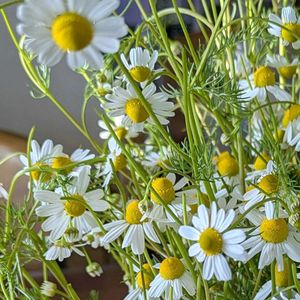 カモミール キク科シカギク属 耐寒性1年草 和名は カミツレ カモミール摘みに行きフレッシュハーブティーを飲みました。 以前ドライのカモミールティー飲んで うむっって感じでしたが フレッシュハーブティーは香り良く優しい味わいで好評でした。 少し青リンゴの香りのような 風邪 頭痛 下痢 等の薬効があるようです。 安眠効果もありそうです。 優しいお花の姿と香りに癒されぐっすり眠れました。