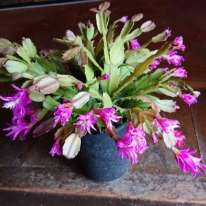 シャコバサボテン クリスマスカクタス 赤と、ピンク デンマークカクタスとも呼ばれ、今朝はほぼ満開です 小さな鉢のこんぺいとうミックスも満開になりました