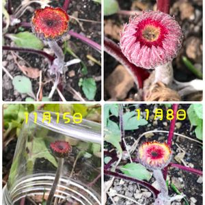 咲くのか咲かぬのか❓ 10月半ばに花芽を付けて、末には可愛く色づいた😊 その後黄色🌼くなったり赤み🌸を帯びたり はたまた首をもたげたり↗️ それで、いつ咲くの? 明日は❄️予報出てるんだよ💦 君だけの温室を❤️ 瓶を被せてあげるから、 握り拳を開いて笑ってちょうだいね🤗