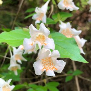オオツクバネウツギ(大衝羽根空木)✨ 白にオレンジ色の網目模様が綺麗です🎵 スイカズラ科 ツクバネウツギ属 花期・5〜6月 果期・10〜11月 ツクバネウツギより花が大きいので この名があります。