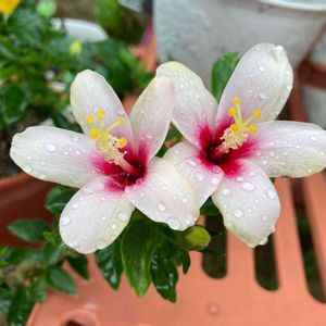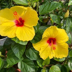 こんばんは、先日の台風でもお外で頑張ってくれてたハワイアンイエローちゃん、スタンダードらしくなって来ました。 3本挿木しではや4年目。 今日は、2輪咲きました。 鉢上から1メートルは、超えたでしょう❗️