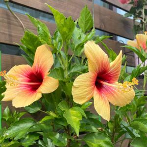 🌺ハイビスカス🌺 今朝は八重咲きイエローとピンクの2輪が咲きました💛💗