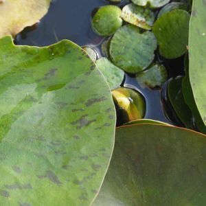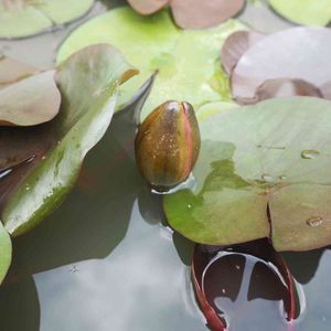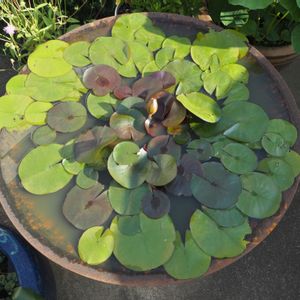「🏷️金曜日の蕾たち」参加します♪ 鉄の洗面器と呼ばれる水鉢の中心に温帯睡蓮ブラック・プリンセスの蕾 …マンカラウボンだと思い込んでいましたが、ブラック・プリンセス(黒姫様)でした どうりで蕾が小さかったワケだ