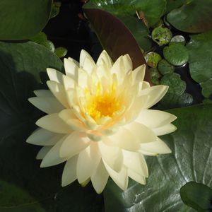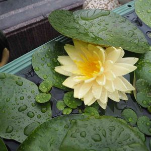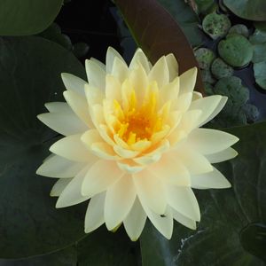 ペリーズダブルイエロー3枚目 雨傘をさして撮影 優しい色合いになりました 肉眼で見た睡蓮とは違うイメージですね 花弁に小さい虫が飛んできて止まりました