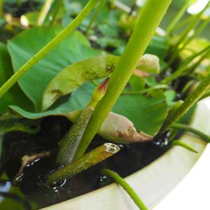 大賀ハスの花芽、3番目 ここも天使にあげるために切られた葉っぱがある 2番目も天使にあげた葉っぱの近くで花芽が上がったし …ご利益かもしれない