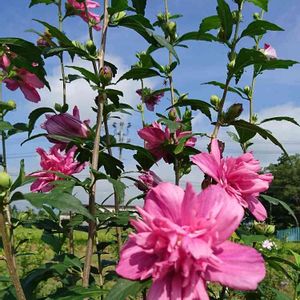 おはようございます😄… 庭のムクゲさんです😉… この子は 昨年9月に30㎝苗で100円だった子です😅💦… 品種は わかりませんが 1㍍くらいに成長してくれてます🤗💕… 蕾もいっぱいなので 得した気分です😊…