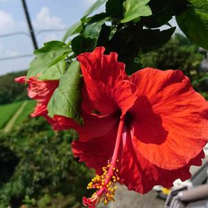 おはようございます😄… もう一枚 ハイビスカス🌺さんです😉… 枝が横を向いてたので ベランダのサッシの隙間から 太陽☀️に向けてあげました😙💕… やっぱり青空が似合います😊…