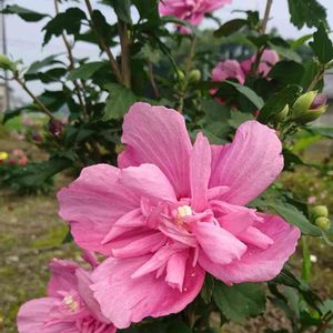 おはようございます😄… 庭のムクゲ(ピンクデライト)さんです😉… 背景に菊も咲いて彩り鮮やかです🤤~💕 やっぱり植物って いいなです😊…