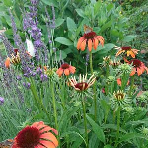 おはようございます😄… my花壇の風景です… 大好きな エキナセアさんが 少しずつ成長してます🤤~💕 後方は 巨大化したルドベキアさん😅… 蝶々も いっぱい… この雨☔で 植物たちは 一気に成長しますね✨… 雑草も成長するけど…😅
