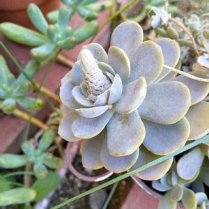 ミセバヤの花🌼が終わったので 思いっきりカット✂️したら、 もう根元にこんなにちびちゃんが😲 小さいバラ🌹みたいで可愛いよ