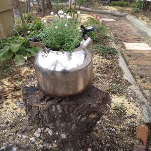 こんばんは😊 今日は蔦かごワークショップの打ち合わせのため、仕事はお休みでした🧺 空いた時間で穴の空いたケトルをちょっとリメイク😉 底に穴を開けて花かんざしを植えてみましたよ🌼