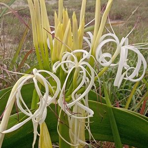 🌿☆^*ハマユウ(浜木綿)*^☆🌿 別名 ハマオモト(浜万年青) ヒガンバナ科ハマオモト属 今年見た蕾に、お花が待ちきれなくて去年のお花をミックスして( ´∀`)σ)∀`)