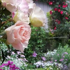 バラのデンティベス と クレマチスのピンクファンタジーのコラボ 同色どうしを仕掛けました バラか?クレマチスか? 良く見なくては判らないのが作戦です😆