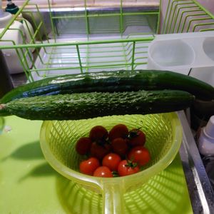 今朝の収穫です。 マクワウリは早いと思いましたが 葉が全体的に少しづつ黄色になって きたので試しに採りました。 うぶ毛?のトゲトゲか痛いので 摘果は手袋が必ずします。 ミニトマトやっとできました。 マクワとトマトは種から育てたので よく育ったネと褒めたいです。