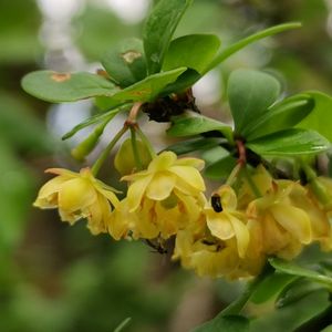 🌼メギ(目木) 別名:コトリトマラズ,ヨロイドオシ メギ科 メギ属 秋に紅葉して冬に葉を落とす落葉低木 株元から幹をたくさん出し細かく枝分かれしてしげる。枝のつけ根あたりに3本のトゲが生えます 春に芽を出して葉っぱが開く頃に小さな黄色い花が下向きに垂れ下がるように咲きます。花後は楕円形の小さな果実が(3/12pic)でき晩秋になると熟して真っ赤に色づくそうです これがあの鋭いトゲを持ったメギのお花なのですね 赤い果実は、もうひとつの植物園で撮影しました