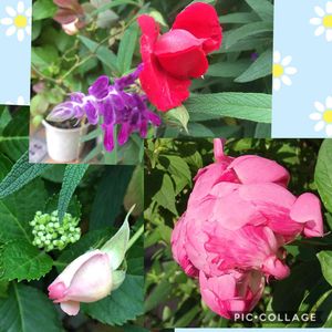 急に暑くなったせいか、八重の芍薬や、いろいろな花が咲き始め、ばらとアメジストセージ、ばらと紫陽花、コラボで咲きました。その代わりに高温で、あっという間に咲き終えてしまいます。写真をあとで撮ろうとしたら、散ってしまったとかありましたー。残念!