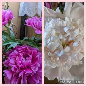 【シャクヤク、八重咲きも】 立てば芍薬…です(イライラしている様らしい ですが、根が生薬で効くとか😊) 近所のお寺さんに咲いています🩷 最後の八重咲きだけ ご近所の奥様が育ててみえるお花です🌸