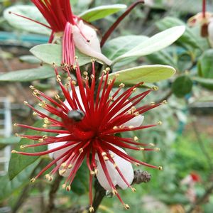 *フェイジョア 赤い雄蕊たち、花弁より際だって主張大です🌱 花言葉…実りある人生