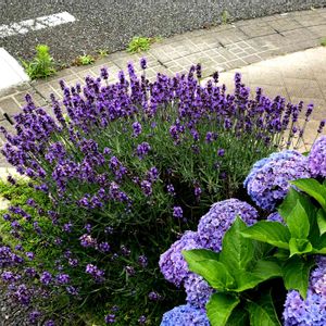 **水色八重咲き紫陽花**と**サルビアネモローサ・カラドンナ**