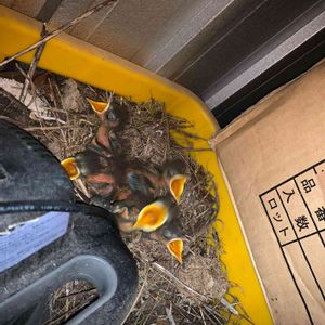 先程、倉庫にて、明日の準備をしていたら ピィ〜ピィ〜🐣鳴き声が?はて!なんやろ って、思いながらハシゴを持ってきて、 棚の上を見たら🤩🤩🤩🤩なぁ〜〜んて ことでしょう(笑) 鳥の雛が、5羽も まだ、目は開いてなくて、でかい口を 開けて、餌をおねだりしてました。😅 うちの倉庫は、安全だと選んでくれたのでしょう °₊·ˈ∗(( ॣ>̶᷇ᗢ<̶᷆ ॣ))∗ˈ‧ 巣立って行くまで、見守ります(*•̀ᴗ•́*)و ̑̑