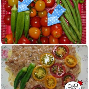 朝の収穫② 『胡瓜』 『いんげん』 『オクラ』 『ししとう』 『ミニトマト』 ミニトマトが大量だったので お昼のパスタソースに 煮詰めました‼️