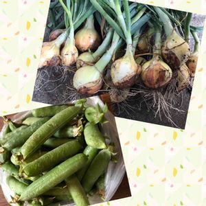 今日も一日お疲れ様でした😊 今日の収穫物🎶 エンドウ豆と玉ねぎ😃 主人の実家からスナップエンドウと聞きもらってきた苗🌱 実際出来たらえんどう豆でした😅💦 豆ご飯が出来るくらいは穫れました🎶 玉ねぎも葉が倒れた物だけたちまち収穫してきました🎶 後残りは次のお休みの日にでも収穫するつもりです😃