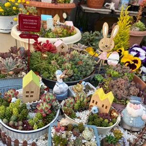 おはようございます! 雨が降ったり、晴れ間が出たりよくわからない天気ですね😁 ちまちま作り貯めた小さな寄せ植えたちを大きなタウンにしてみました! 100円ショップで買いためた小物たちも引っ張り出し〜 地植えが出来ない分入れ替え可能なお庭ですー笑。 皆さんには笑われてしまいそうですがー 見てほしくて投稿しました🤗🤗🤗