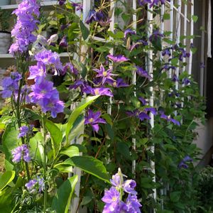 紫ばっかり😅 手前は千鳥草💜 後ろのフェンスには、クレマチス 大流とエリオステモン❣️