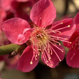 おはようございます☔ 今朝は雨が降っています。 公園散歩で 早咲きのカラミザクラ(シナミザクラ)に出会いました💮梅の花に似ていて 雄しべが長いお花です😊 青空に映えて とても華やかでした😀