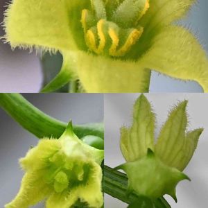 グリーンカーテンにした《沖縄雀瓜》チュラウリに、花が咲いていました♬上が雄花で、下が雌花💚☺️ うなじの下のとこ、これから実っていくの楽しみです💕