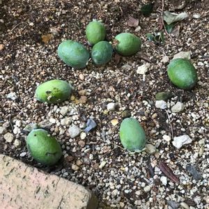 フェイジョアの実 落下中です〜🙄🌳🍃 たくさん落ちてました〜! 柔らかいもの(多分、落ちて日が経ったもの)を手で割って食べたら 甘くて美味しい〜(*´꒳`*) 梨🍐を柔らかくした感じかな? パイナップル🍍ととリンゴ🍎とバナナ🍌を合わせた味...って表現してる方もいて... まーそんな気ももします╰(*´︶`*)╯ PPAP...じゃなくてPPAB😅💦
