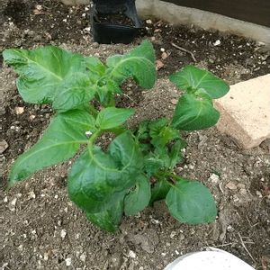 残渣処理のキエーロから発芽したもの。しばらくして大きくなったので掘り起こしたらジャガイモでしたw 青くなっていたものをそのまま埋めていたらしく、芽が出て放置したらこうなった。 畑に移動しました。