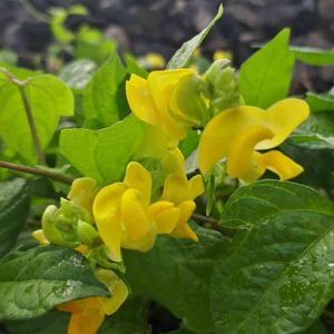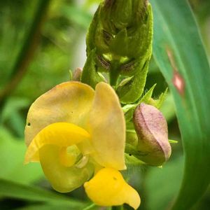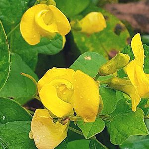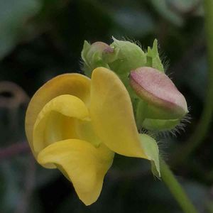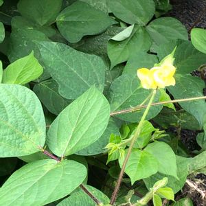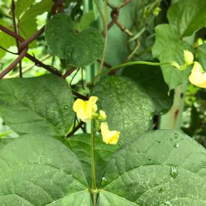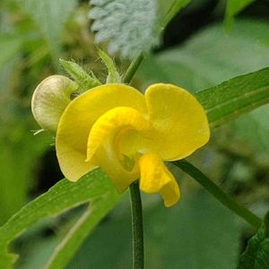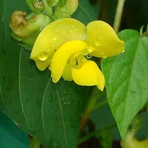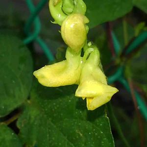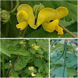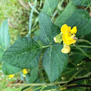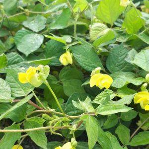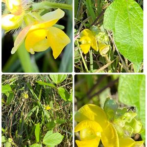 東京都八王子市 小山内裏公園にて 撮影日:2021-09-05 ヤブツルアズキ 先のとがった葉が三枚ずつ出るつる植物で、 丸み のある黄色い花が咲きます。 花期は8月後半から 9月頃です。 小豆の原種と言われています。