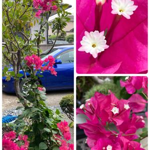 今朝の庭から おはようございます😃 💖ブウゲンビリア💖 ローズピンク💕の苞に 包まれ うすいピンクがかった白色の🤍小さな花を咲かせ 夏の玄関先を華やかに💕 飾ってくれる ブウゲンビリアです🎶〜