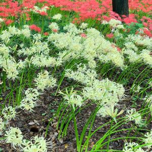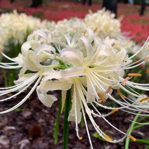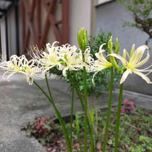 二年目の白花曼珠沙華 地植えにしてから 花茎が増えて10本出ました 風も心地よくなり 秋の風情を感じます...♪*゚