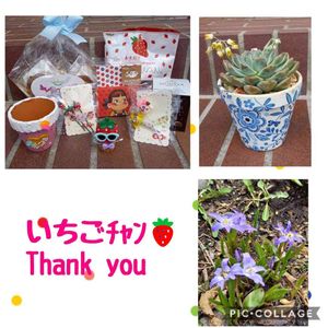 こんばんわ〜⭐️ 今日は空が霞んでいたよね〜💦 黄砂だったのかなぁ😅 今日も気分を明るくしてくれる 素敵なプレゼントが届きました💖 バラと夢CLUB2周年🌹 いちごちゃんのプレ企画のシークレット部門で当選いたしました♡\(*ˊᗜˋ*)/♡ 初めてお迎えするコルクベリーちゃん🍓 がんばるぞぉ〜ってお手手あげてるみたい🎶 いちごのお花も付いてて可愛いね💕 皆さんのpicでよくお見かけするコルクベリーちゃんをやっとお迎えできたよ🥰 可愛くて美味しそうなリメ鉢💖 いちご🍓やハシビロコウくんのピックも💖 そして美味しそうなお菓子まで💖 いちごちゃん❣️ 盛り沢山なプレゼントをどうもありがとうございました(*๓´╰╯`๓)♡ 大事にするね💕