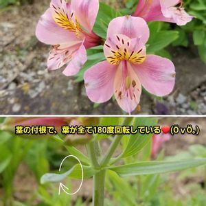 こんなの始めて見た!!😯 〜 葉っぱが皆んなねじれて裏が表に!! つけ根のところで180度ねじれていて、裏面が上になってます😅 なんでなんだろうね??? 花と話ができたら聞いてみたい🤗 〜 花は、 6枚の花弁のうち、内側の3枚の上の2枚に条斑、条紋模様があるのが特徴です。 (縞模様がないものもあります)