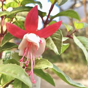 おはようございます😃 「ガーデンフクシア スノーキャップ」。 先月お迎えして、初めてのお花が咲きました✨ フクシアって大好きなんだけど、いつも夏に枯らしちゃって、、😭 南国九州では無理なのかなー、と諦めてましたが、時は経ち、品種改良も進み、「暑さ寒さに強い」! お名前に「ガーデン」までついてる!ならば、ひょっとしたら育てられるかも😍 期待してますよ、ガーデンフクシアさん✨