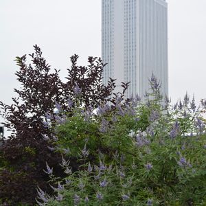 キレイな紫の花を咲かせます。今年は何度も咲きました。 落葉樹です。 夏の成長が半端ないです。 お名前教えてください!